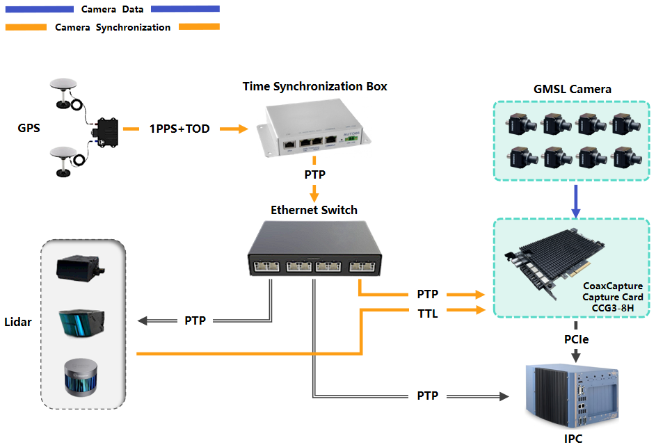 - The GPS provides 1PPS and TOD signals to the time synchronization box, which then outputs PTP information via Ethernet to the capture cards and other devices.
