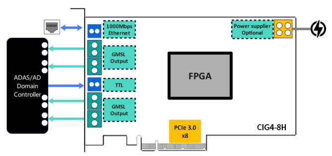 The CIG4-8H is a specialized PCIe hardware solution designed to inject pre-recorded or simulated video data directly into automotive Electronic Control Units (ECUs) through authentic GMSL (Gigabit Multimedia Serial Link) interfaces. This enables comprehensive testing and validation of ADAS/AD algorithms without requiring physical cameras or real-world driving scenarios.